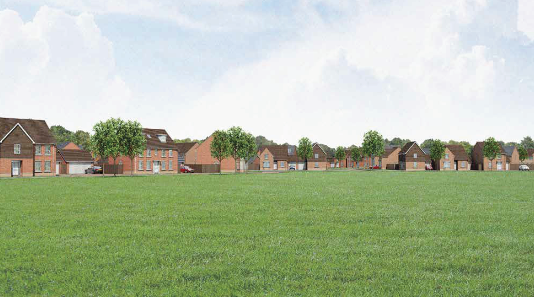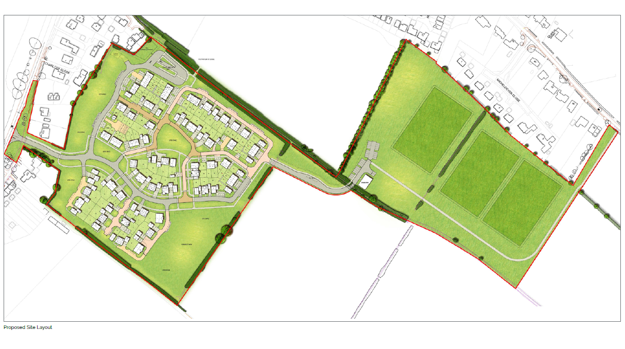 The scheme comprises 100 residential dwellings, a school bus drop off area, public open space and new recreational facilities, including a sports pavillion and Sports England standard football pitch.